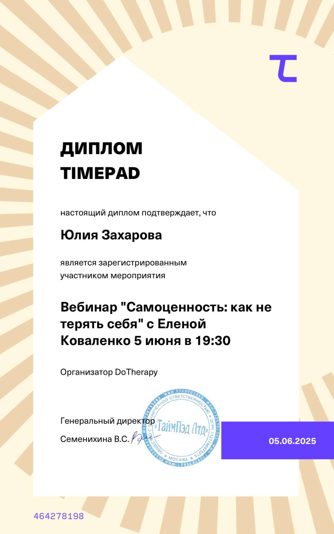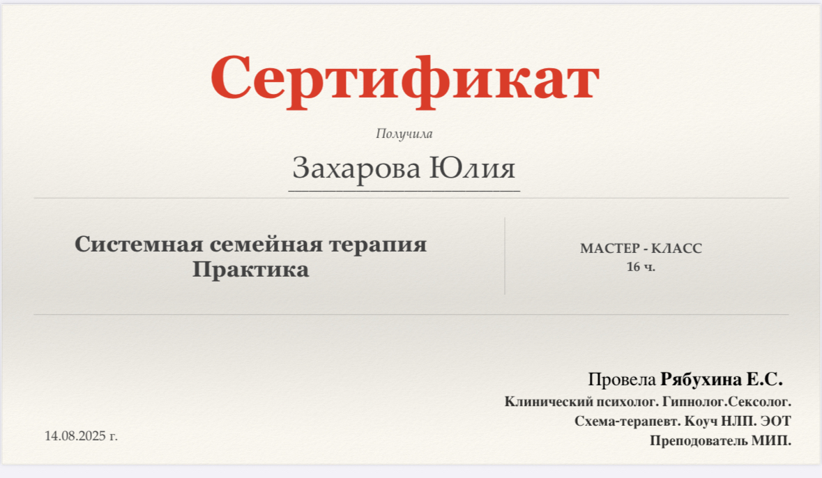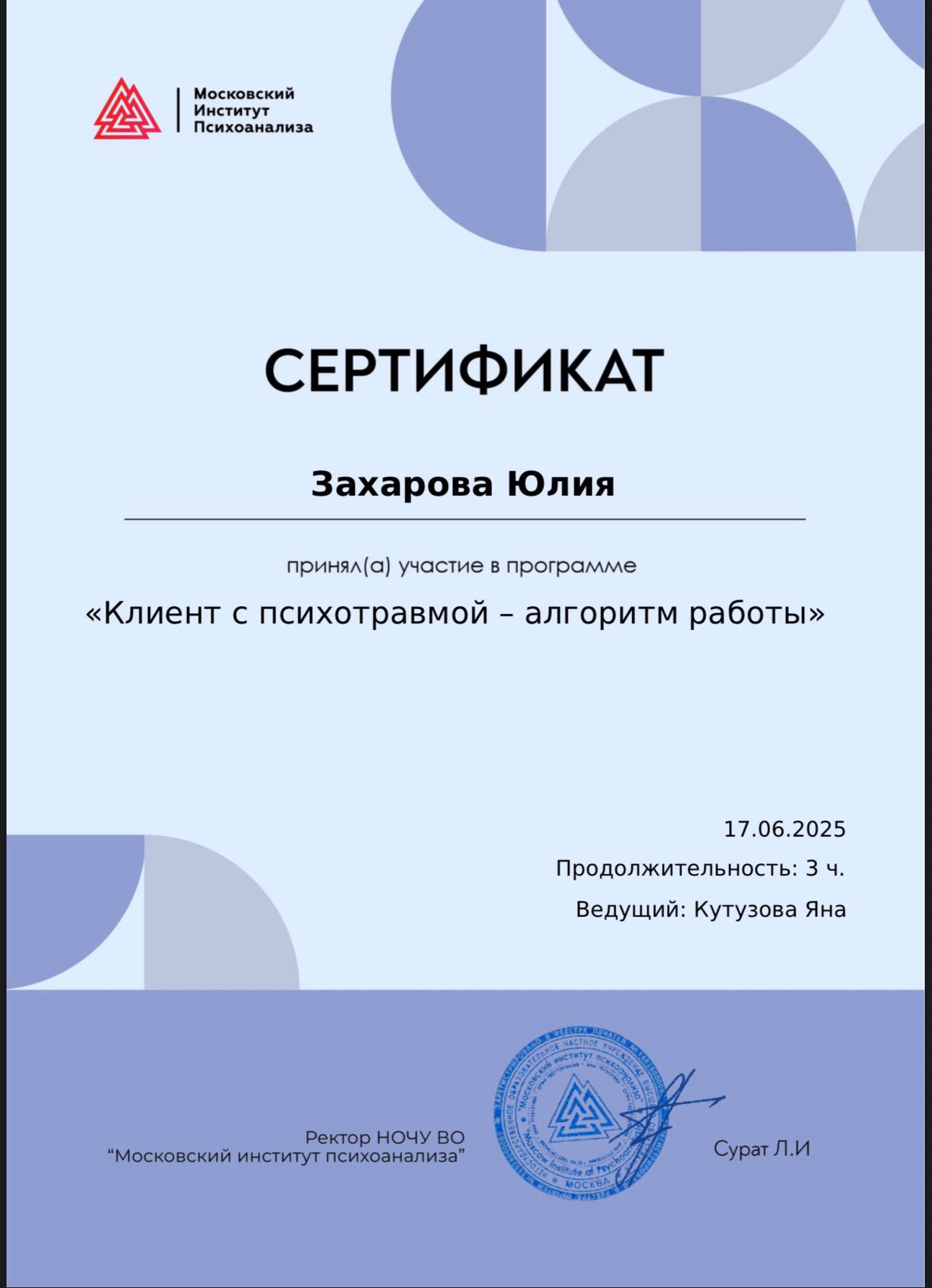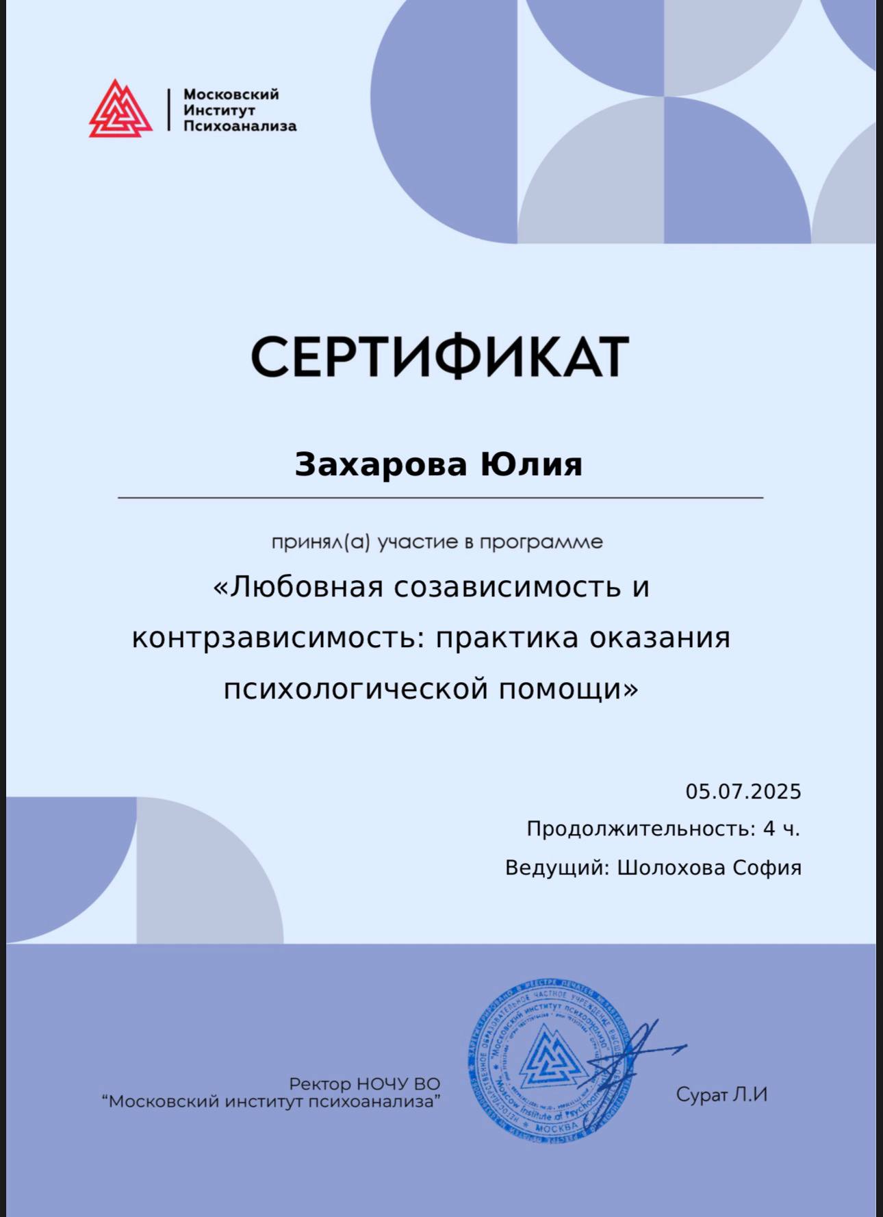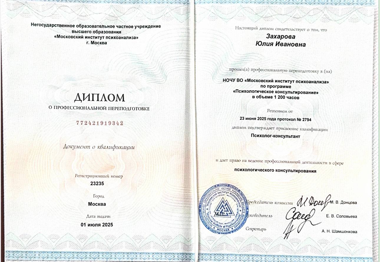 Диплом о профессиональной переподготовке , квалификация Психолог консультант . Московский Институт Психоанализа
