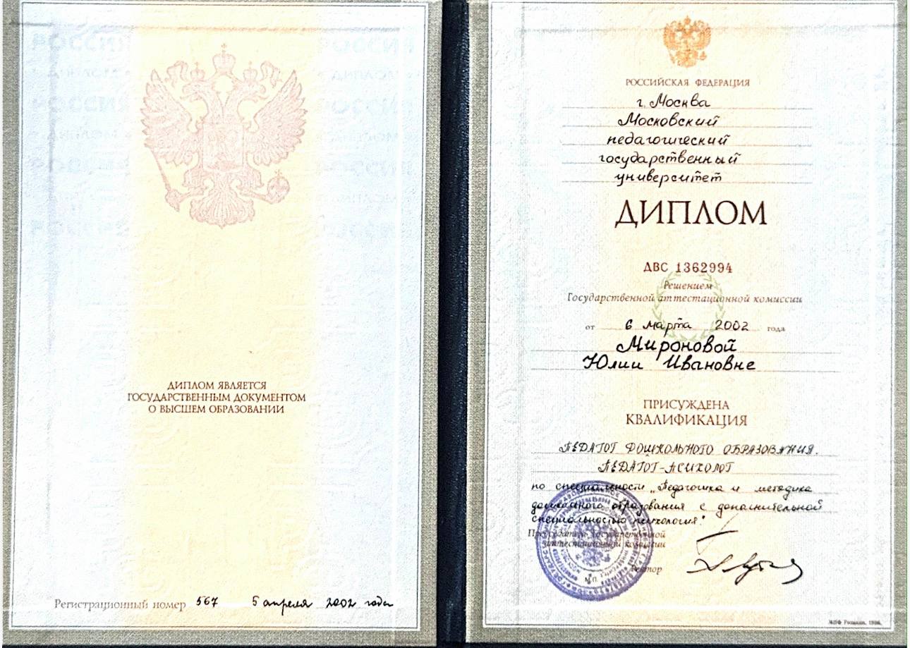 Диплом о Высшем образовании , квалификация: Педагог- Психолог . Московский Педагогической Государственный Университет .